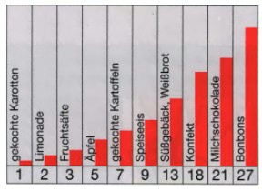 ![]() | Die Tabelle gibt Ihnen einen Überblick, wie kariesauslösend verschiedene Nahrungsmittel im Vergleich zu einer gekochten Karotte sind.